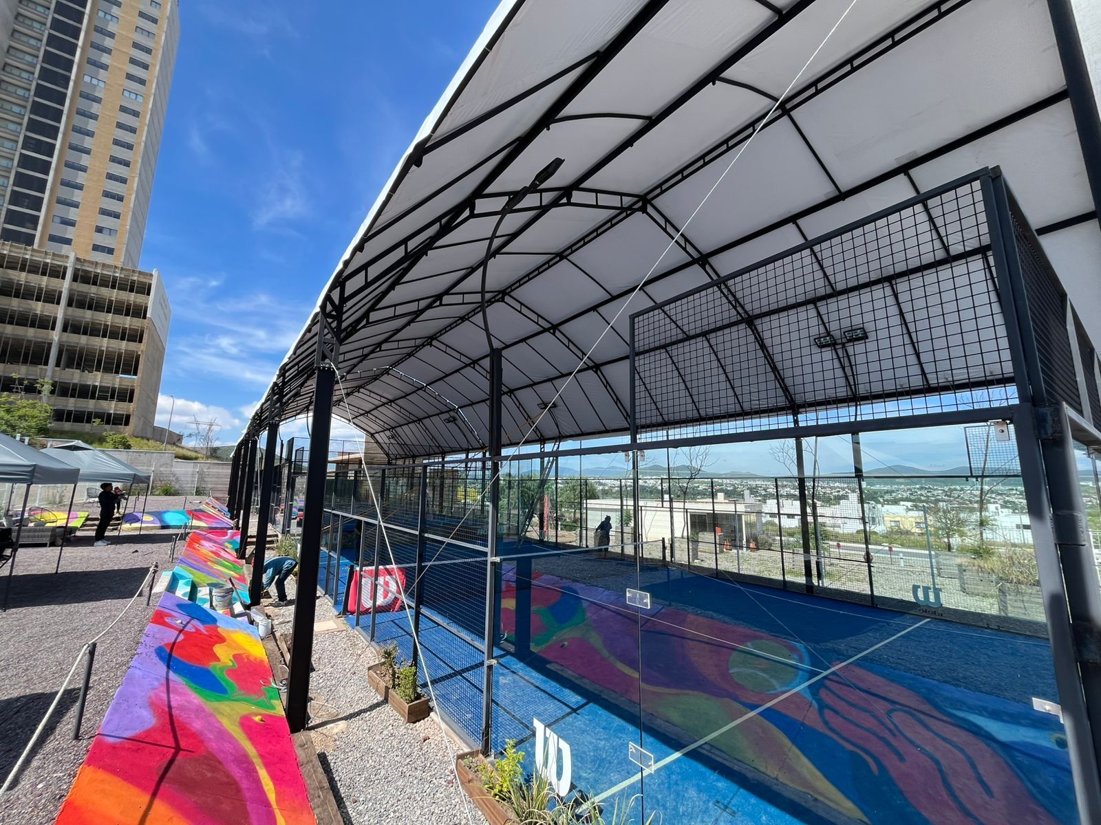 Cada estructura se elabora con herrería reforzada y lona tensada, ideal para proteger y embellecer espacios como patios, terrazas, canchas deportivas, áreas recreativas y negocios.